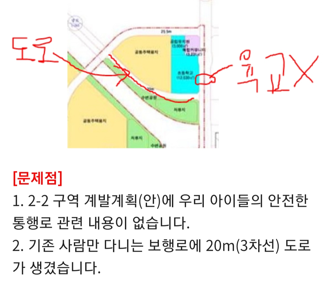 도안지구 2-2 개발계획에 2023년 개교할 (가칭 )복용초에 대한 안전 통학로 계획이 없습니다 동서대로 인근 계획된 초중교에는 육교나 지하도 통학로 확보방안을 마련하도록 심의의견을 받은바 있으나 복용초 통학로에 대한 안전 조치가 없는 것은 일관성 없는 행정조치이며 최근 대두되는 민식이법에 입법 추진방향 역행하는 조치입니다 육교 또는 지하도 건설을 도안지구 2-2계획에 반드시 포함시켜주십시오 ㅔ |
