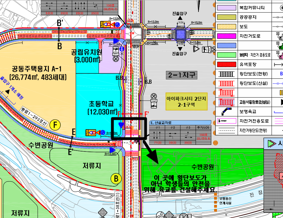 2021년 11월 준공 예정인 대전 아이파크시티와 복용초등학교 사이에 육교 건설을 부탁드립니다. 민식이법 통과 등 학생들의 안전한 통행로 확보가 사회적으로 크게 이슈가 되고 있습니다. 2021년 11월 준공 예정인 아이파크시트와 22년 9월 개교 예정인 복용초등학교 사이에는 7~8차선 대로가 계획되어 있습니다. 학생들의 안전한 통행로 확보를 위해 육교를 만들어줄 것을 간곡히 부탁드립니다. 본 제안에 대해 유성구청 도시과에 문의 결과 2-1지구 아이파크시티 건설 전 시행한 육교 건설 등과 같은 학생들의 안전한 통행로 확보를 위해 교통영향평가에서 충분히 논의되지 않았고 2-2지구가 개발됨에 맞춰 2-2지구 교통영향평가위원회에서 논의하기로 했다고 합니다. 그러나 2-2지구 교통영향평가위원회에서는 다음을 근거로 육교 건설을 하지 않기로 했습니다. 첫째, 육교가 있음으로 해서 횡단보도를 설치하지 않으므로 무단횡단의 가능성이 더 많다. 둘째, 횡단보도와 육교를 같이 설치했을 때 횡단보도가 더 편리하게 이용되기 때문에 육교는 방치될 가능성이 있다. 셋째, 최근에는 사람 보행 중심의 평면교차를 설치한다.그리고 이에 대한 대안으로 어린이보호구역을 지정하고 안전 시설물을 설치하는 것으로 의견을 모았다고 합니다.그러나 이 글을 읽고 계신 분의 자녀가 7~8차선 대로를 횡단보도로 다니는 것과 육교를 통해 다닌다면 어떤 시설물이 더 안전할 지 한번쯤생각해주십시오. 육교가 있음으로 해서 아이들은 안전하게 통학할 수 있습니다. 자동차는 사람이 운전하는 기계입니다. 사람은 때때로 실수를 하기 마련입니다. 어린이보호구역을 지정하더라도 사람은 언제나 그렇듯 실수를 하고 사고가 날 수 있습니다. 안전 사고는 예방하는 것이지 사고가 일어나고 처방해서는 안됩니다.이에 첨부한 이미지와 같이 육교 건설을 부탁드립니다. 본 위치에 육교 건설을 제안한 이유는 다음과 같습니다. 첫째, 육교는 교통약자를 위한 편의시설 중 하나로 어린이들이 안전하게 다닐 수 있는 시설입니다. 반론으로 노약자나 장애인은 불편할 수 있다고 말할 수 있겠으나 아이파크시티와 초등학교 사이에 주로 다니는 교통 약자는 어린이입니다. 아래 지도를 살펴보시면 노약자나 장애인을 위한 편의 시설이나 상업시설 등이 계획되어 있지 않습니다. 둘째, 제안한 곳의 위치는 삼거리로 삼거리에 계획된 횡단보도 세 곳 중 한 곳을 육교로 설치한다면 학생들이 육교로 갈지 횡단보도로 갈지 개인의 상황에 맞게 선택하여 통학할 수 있습니다. 또한 삼거리 중 횡단보도 중 위에 위치한 횡단보도는 학교와 아이파크시티를 바로 이을 수 있고 아래 횡단보도는 초등학교 아래 예정되어 있는 저류지와 아이파크시티 아래에 위치한 수변공원을 이을 수 있어 통학이 아닌 다른 목적을 위한 통행도 불편함 없이 이용할 수 있습니다. 예를 들어 2-2구역 내 주민들의 2-1구역 내 수변공원을 이용하는 경우를 말합니다. 셋째, 보행중심의 평면교차를 그대로 진행하되 육교를 설치하는 것으로 최근 흐름인 차량 중심이 아닌 보행중심의 교통 통제에 반하지 않습니다. 넷째, 육교 건설이 무단횡단의 가능성을 높인다면 통행분리시설 설치를 통해 무단횡단을 예방할 수 있습니다. 다섯째, 육교를 원하는건 아이파크시티 입주민입니다. 다른 누구도 아닙니다. 그곳을 실제로 이용하는 사람은 아이파크시티의 소중한 자녀들입니다. 우리가 원해서 만들어 달라는 시설이 방치될 가능성이 높아 설치하지 않는다는건 앞뒤가 맞지 않습니다. 여섯째, 사업 시행자인 유토와 이를 승인한 대전 시청 및 유성 구청은 입주민들의 목소리에 귀기울여야 합니다. 본 아이파크시티 아파트는 2-1지구 사업지구내 위치한 사업장으로 입주민들의 분양금을 통해 아파트뿐만 아니라 주변 기반시설도 만들어지고 있습니다. 입주민들의 분양대금 뿐만 아니라 각종 세금까지 더해져 주변 시설이 만들어지고 있음에도 왜 입주민들의 목소리를 들으려 하지 않으십니까?다시 한번 간곡히 부탁드립니다. 2560세대 아이파크 입주민은 아이들의 안전한 통학로 확보를 그 누구보다 원하고 기존 횡단보도는 안전을 보장하지 않습니다. 육교 건설을 부탁드립니다. |