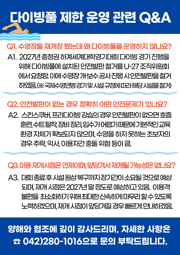 1. 대회 일정 대비 지나치게 긴 폐쇄 기간 (과잉 행정) 대회는 2027년 8월 개최 예정이나, 공단은 2026년 초부터 2027년 말까지 약 21개월간 시설을 폐쇄하기로 결정했습니다. 12일간의 대회를 위해 1년 5개월 전부터 시민의 이용을 막는 것은 전례 없는 과잉 행정입니다. 2. 안전발판 제거를 핑계로 한 책임 회피 안전발판은 법적 용어도, 국제 규격 용어도 아닙니다. 이는 대전시설관리공단이 시설 폐쇄의 명분을 만들기 위해 임의로 명명한 용어에 불과합니다. 해당 시설물은 수심이 깊은 풀에서 이용자의 일시적인 휴식과 대기를 돕는 보조 발판 일 뿐입니다. 이를 안전과 결부시켜 제거했기 때문에 불안전 해졌다는 논리는, 시설 운영의 편의를 위해 위험성을 과하게 부풀린 공포행정입니다. 발판이 없어서 위험하다는 논리는 전국의 다른 잠수풀 운영 사례와 맞지 않으며, 이는 새로운 안전 가이드라인 수립과 인력 배치라는 본연의 관리 책임을 방기하는 것입니다. 공단은 발판이 없어서 위험하다고 주장하지만, 이는 스스로의 과거 관리 실태를 부정하는 자가당착입니다. 기존에도 다이빙풀 전체에 발판이 설치된 것이 아니었습니다. 특정 구간에만 설치되어 있었으며, 나머지 대부분의 구역은 발판 없이 운영되어 왔습니다.만약 공단의 주장대로 발판 없는 상태가 사망 사고 등 중대사고 위험이 있는 상태라면, 그동안 발판이 없던 구역에서 시민들이 다이빙하도록 방치한 공단은 중대 과실을 수년간 방치해온 셈이 됩니다. 이제 와서 발판 제거를 이유로 시설을 폐쇄하는 것은, 대회를 핑계로 시민의 이용을 막으려는 비겁한 행정 편의주의입니다. 3. 시민의 권리 박탈과 예산 낭비 대전 내 유일한 공공 잠수풀을 3년이나 닫아둠으로써, 시민들은 울며 겨자 먹기로 3배 이상 비싼 사설 시설을 이용하거나 타 도시로 원정을 떠나야 합니다. 공공기관이 시민의 경제적 부담을 가중시키면서까지 특정 대회의 행정적 편의만 우선시하는 것은 공공시설 건립 취지에 정면으로 반하는 처사입니다. 공단은 안전과 대회 준비라는 명분을 내세우고 있으나, 실상은 관리의 어려움을 피하려는 행정 편의주의이며, 이로 인해 시민들의 일상적인 체육 권리가 부당하게 희생되고 있습니다. |