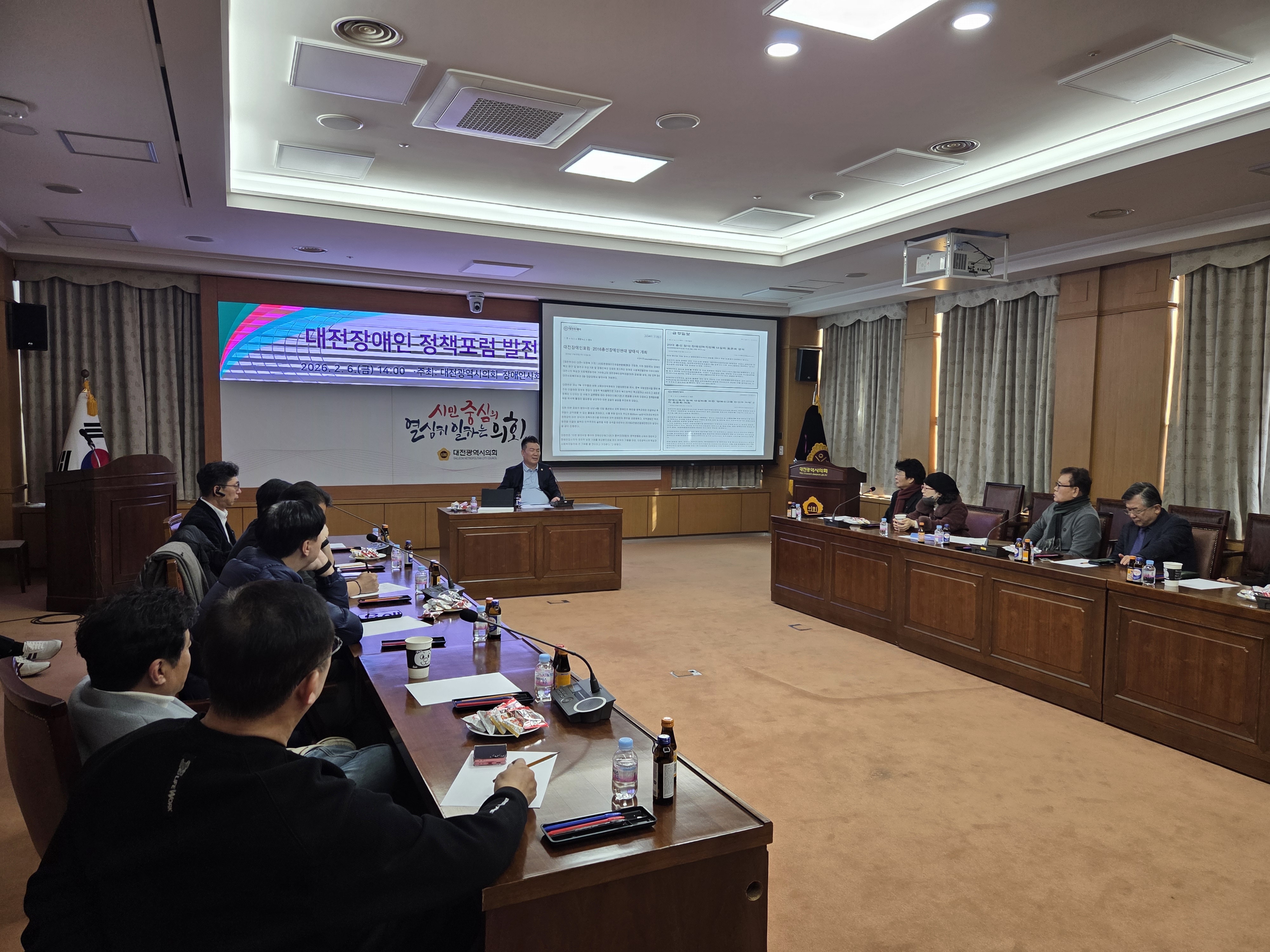 대전시의회 황경아 부의장(장애인사회참여증진특별위원장)은 대전장애인정책포럼 관계자들과 6일 대전시의회 소통실에서 포럼 발전방안에 대해 논의하는 간담회를 가졌다. 이번 간담회는 장애인단체 간 협력 강화와 장애인정책 변화에 대한 효과적인 대응 방안을 모색하기 위해 마련됐다.